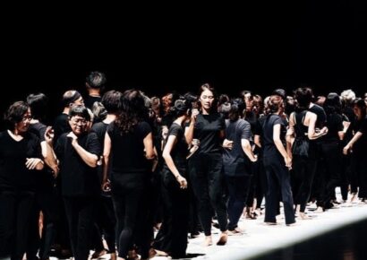 Featuring large-scale adaptations of Sibosado’s traditional Bardi (pearl carving) designs, Charles Davis’ set is spectacular, enhanced to perfection by Damien Cooper’s lighting. With the addition of Craig Wilkinson’s kinetic video design and Elizabeth Gadsby’s line-expanding costumes, the dancers become extensions of Sibosado’s striking artwork.