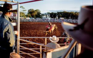 I’m seeing it through a cultural lens, but it was the camera lens that hauled me here out of curiosity. Melbourne photographer Michael Danischewski followed the Victorian rodeo circuit from 2018 to 2025. Photos from his book, ‘Trouble Rides a Fast Horse’, were exhibited at the 2025 Ballarat Foto Biennale. They’re vignettes of a community subculture parallel to, but distinct from, my own.