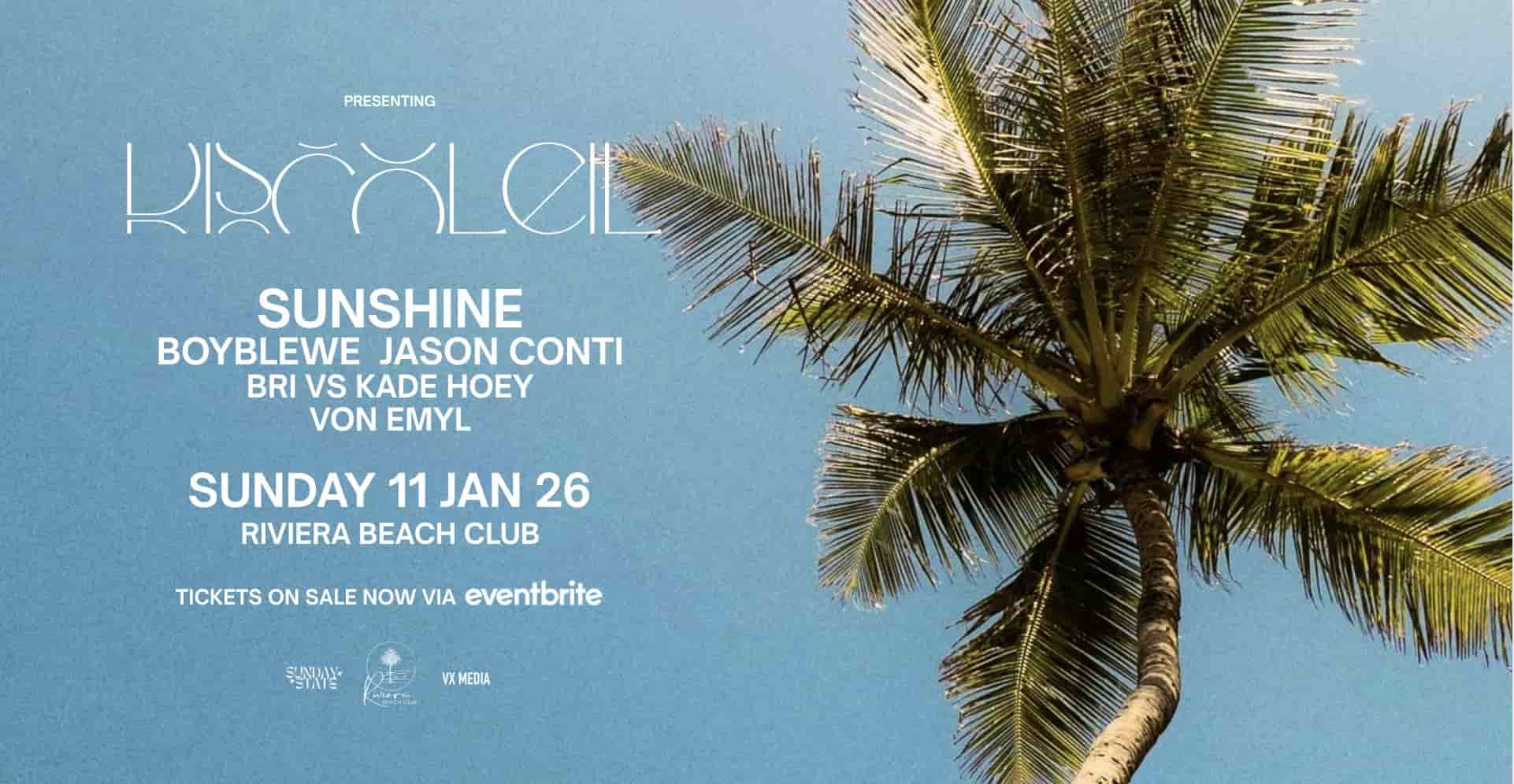 Spinning at Riviera Beach Club on 11th January 2026, DISCOLEIL is headlined by Sunshine and supported by a score of local talent, including BoyBlewe, Jason Conti, Bri, Kade Hoey, and Von Emyl.