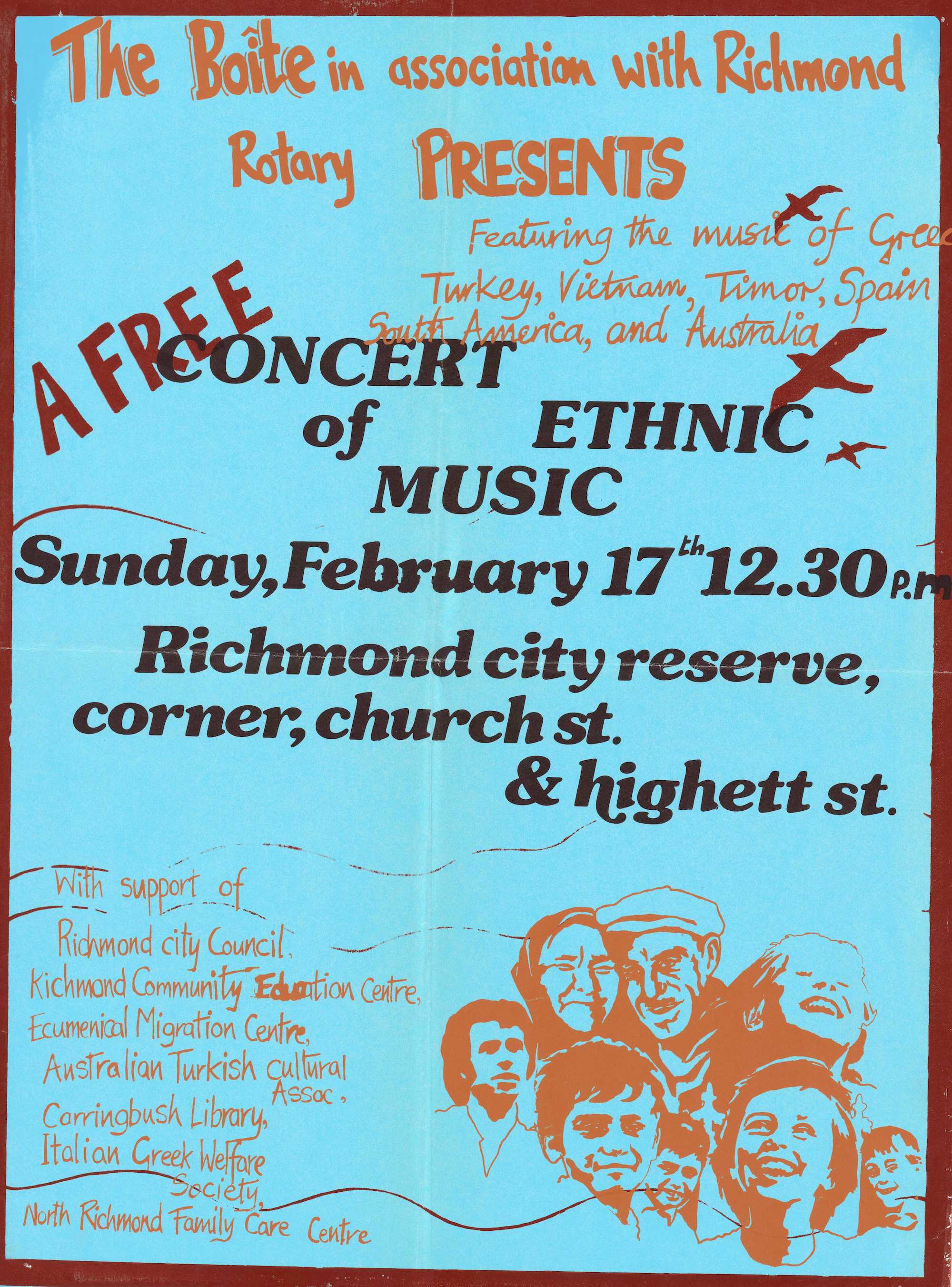 Community radio has long played a role in supporting Melbourne’s diverse arts community. In the mid-1980s The Boite began seeking opportunities for coverage on PBS FM, and in 1987 presenter Raymond Mow devoted two consecutive programs to The Boite. This led to a ten-part series on PBS produced and presented by The Boite’s Gwenda Davies, which initiated 16 years of regular broadcasting at the station. The Boite moved to 3CR in 2006, which is where Therese Virtue currently presents Music Sans Frontieres.