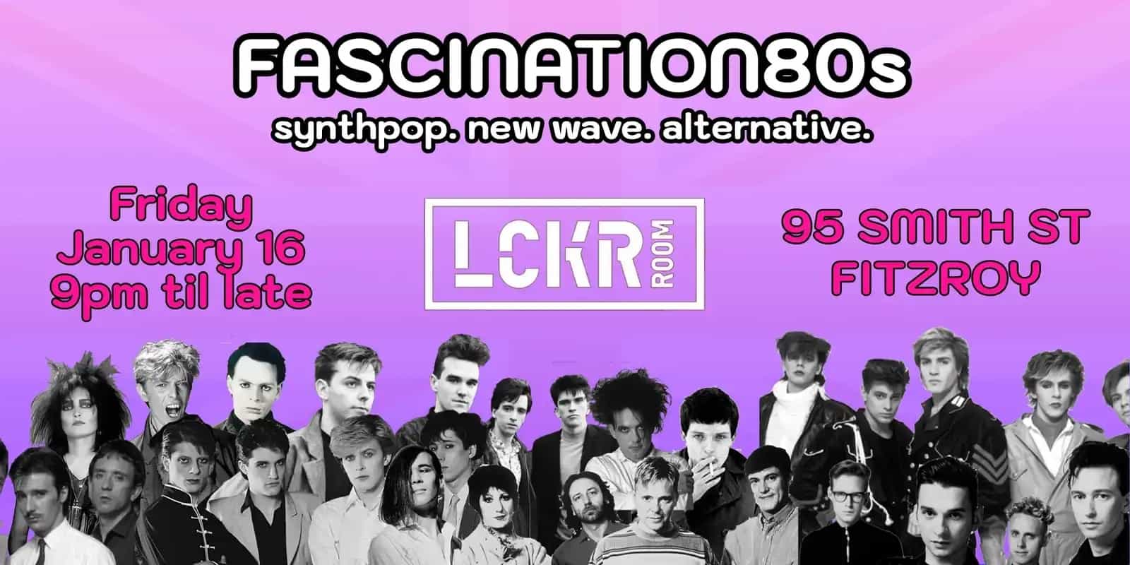 Gig Guide Fascination80s #24 LOCATION LCKR ROOM, 95 Smith St, Fitzroy VIC 3065 DATE Fri 16 Jan 2026 Time 9pm LINEUP DJ Eddie Monsoon Support more PRICE FREE Genre Pop Fascination80s returns for 2026! Join us on Friday January 16 for a tasty serving of 80s synthpop, new wave and alternative tunes! Starts at 9pm and is FREE ENTRY! Tickets & RSVP Add to calendar Google Outlook Yahoo READ NEXT Daydream80s #6: new wave. pop. alternative. daytime.
