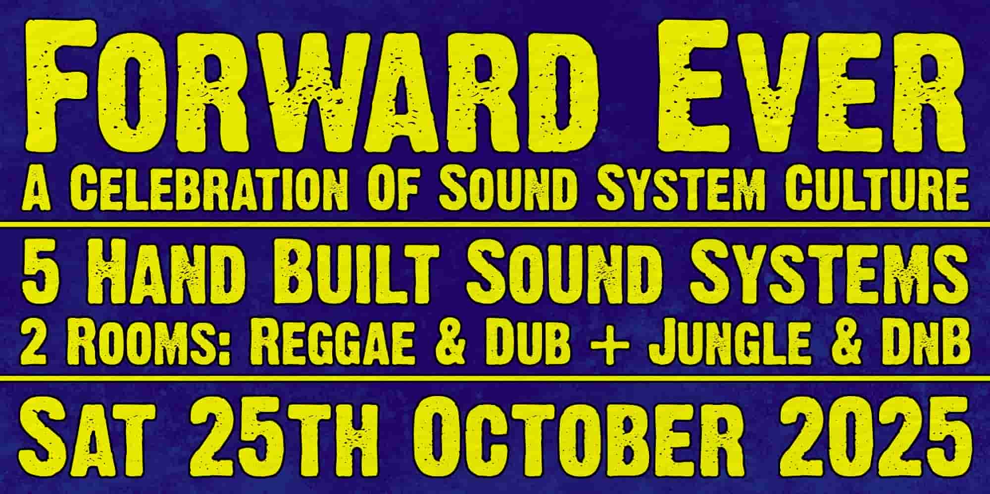 Forward Ever is excited to return to the Croxton Bandroom for our 22nd Celebration of Sound System Culture. Join us on Saturday 25th October as we present a historic night of heavyweight Sound System music & culture bringing together our biggest ever line up with 5 massive, hand built, DIY Sound Systems spread over 2 rooms playing the best in Reggae, Dub, Steppers, Jungle, Drum N Bass and Beyond. Do not miss out on this opportunity to see 5 big, bad & heavy Sound Systems strung up together playing to their full potential with a huge line up of special guest DJ’s, Singers, MC’s & Players of Instruments!!!