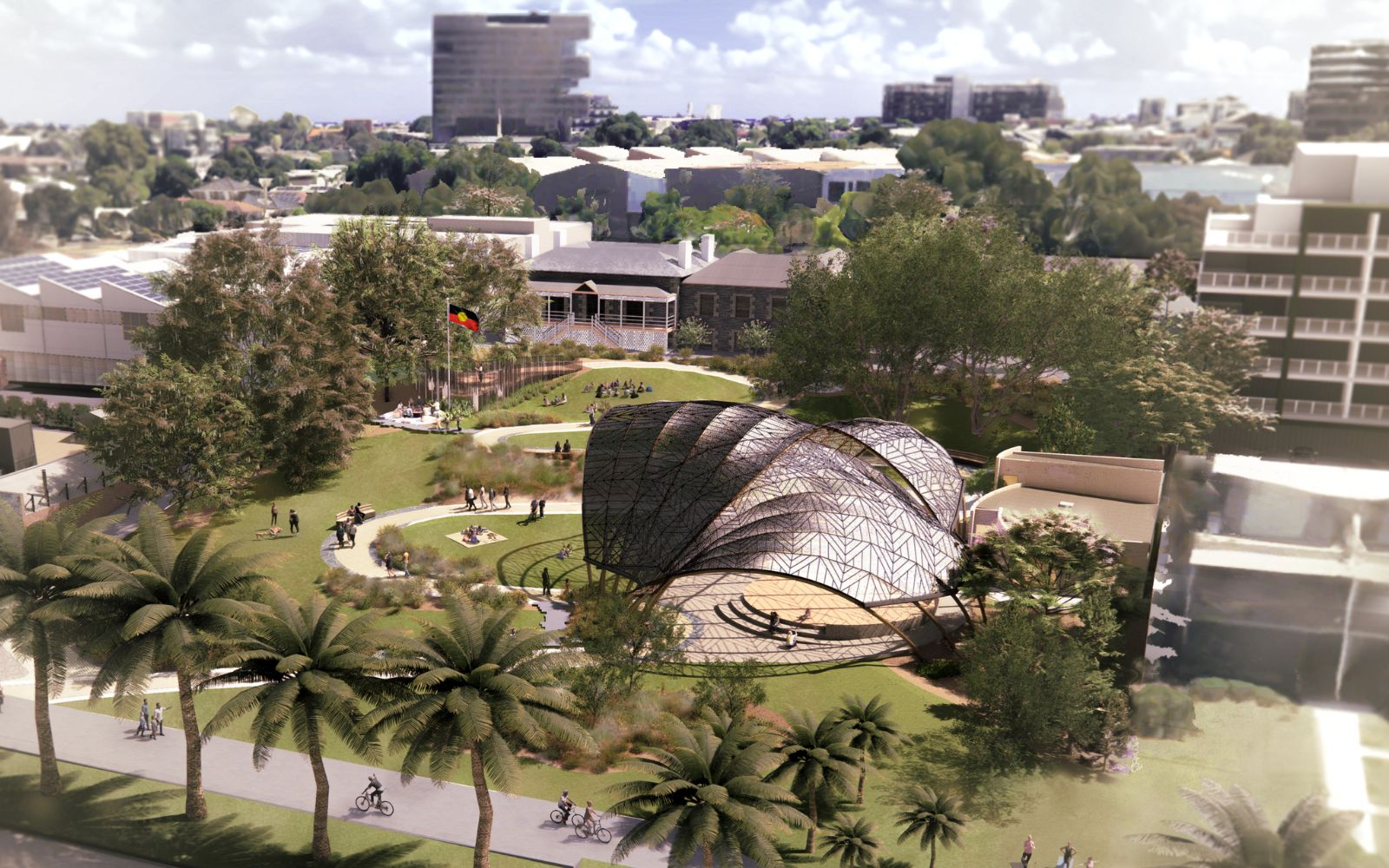 The $8.7 million Victorian government-funded project was designed by MGS Architects with landscaping by Simone Bliss Landscape Architects. The centrepiece is a stage with three overlapping shells covered in patterns by First Nations artist Moorina Bonini, drawing from South Eastern Kulin Nations mark-making that represents Ancestors watching over performers.