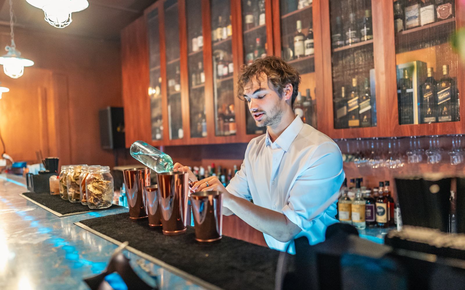 The Devil’s Corner is a deliberately intimate space bathed in deep sapphire hues that transforms the atmosphere next to the bar’s open kitchen. Soft jazz music weaves through the air, encouraging patrons to lose themselves in introspection about their deepest, darkest desires while remaining part of the broader Lieu Privé experience.