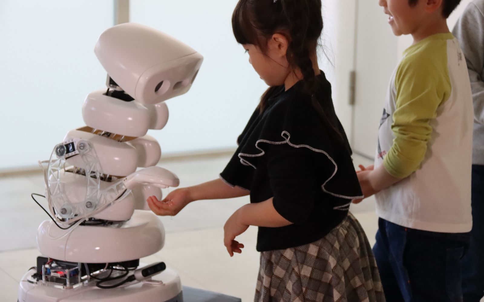 Each work comes with playful how-to-interact stickers ranging from ask me a question to give me a cuddle. The exhibition is designed for slow engagement with bright colours, playful materials and spaces to pause and interact, whether stroking Qoobo, a cushion-like robot with a wagging tail, or gazing at hypnotic lights.